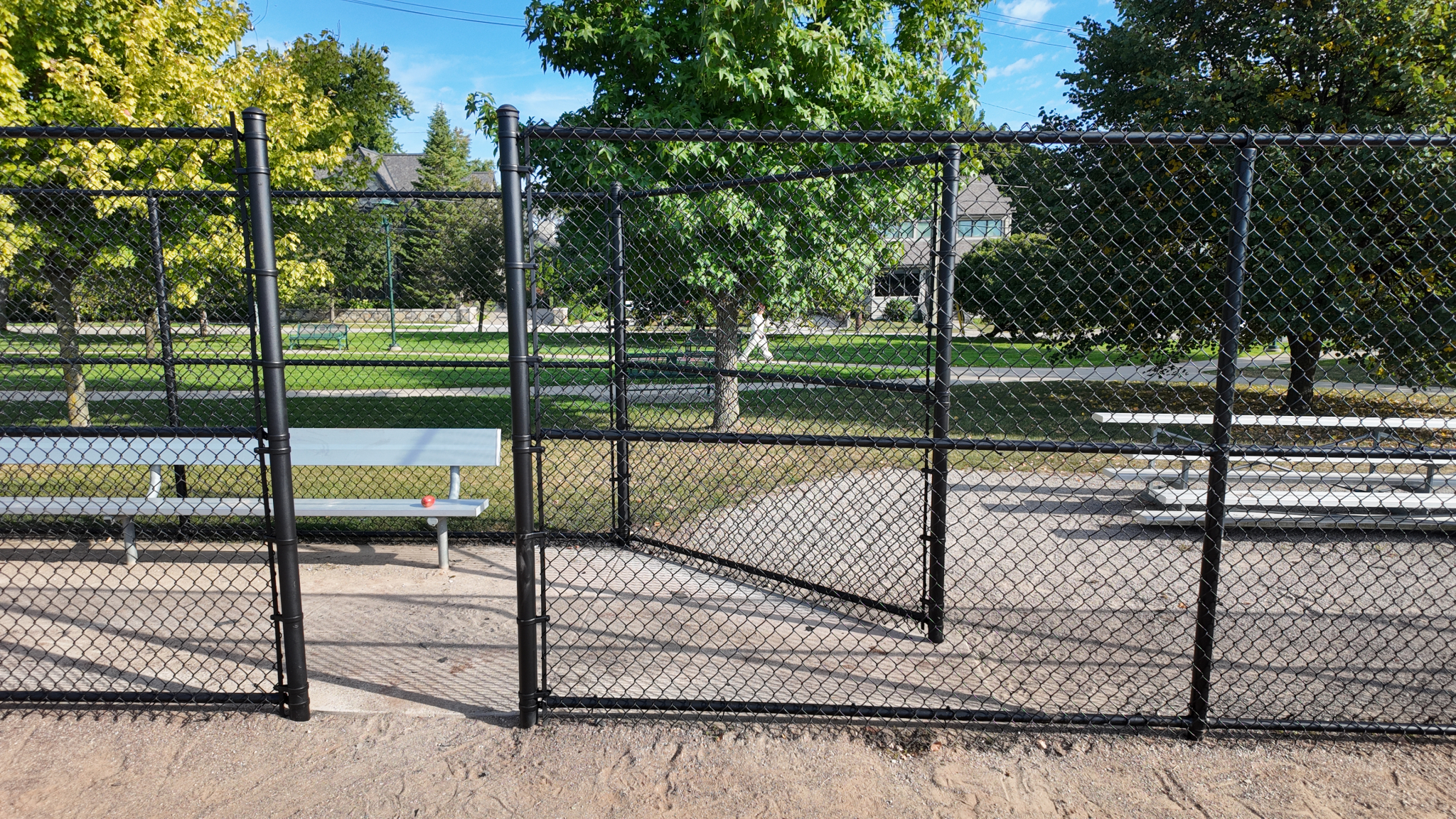 The dugout entrance was showing its age—chalking paint, pitted fittings, and a top rail etched with rust.
