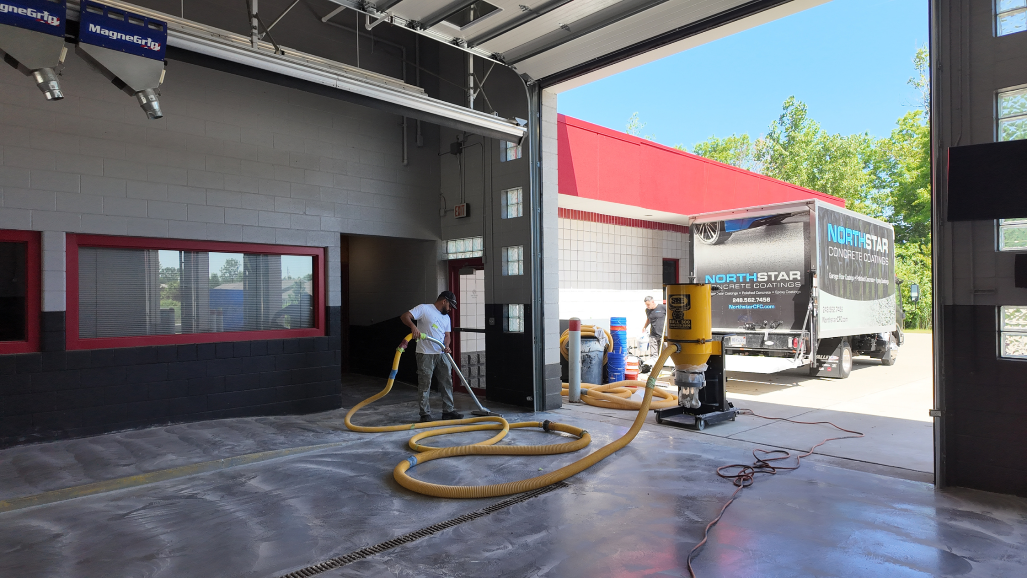 We mechanically ground the floor, corrected a ½" joint lip in Bay 1, and cleaned to white-glove standard before coatings.